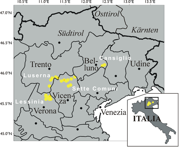 В горных долинах на западе провинции Виченца (область Венеция) расположены 6 цимбрских общин, ни в одной из которых больше не говорят по-цимбрски.