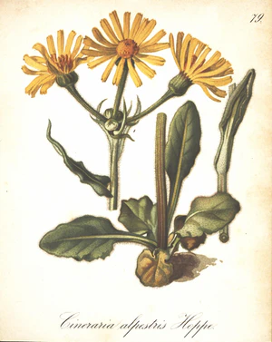 Cineraria alpestris. Ботаническая иллюстрация из работы Die Alpenpflanzen nach der Natur gemalt (1881) |