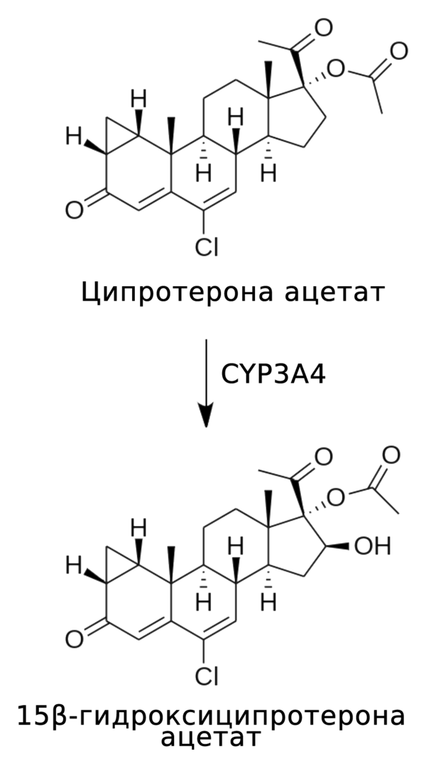 Ципротерона ацетат метаболизируется путём гидроксилирования и конъюгации. На первой фазе происходит катализ преимущественно изоферментом цитохрома Р450 CYP3A4. Основным метаболитом в плазме крови является 15β-гидроксипроизводное — 15β-гидроксиципротерона ацетат.