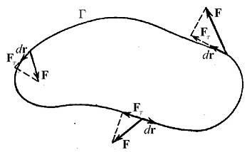Если F — некоторое силовое поле, тогда циркуляция этого поля по некоторому произвольному контуру Γ есть работа этого поля при перемещении точки вдоль контура Г. Отсюда непосредственно следует критерий потенциальности поля: поле является потенциальным когда циркуляция его по произвольному замкнутому контуру есть нуль. Или же, как следует из формулы Стокса, в любой точке области D ротор этого поля есть нуль.