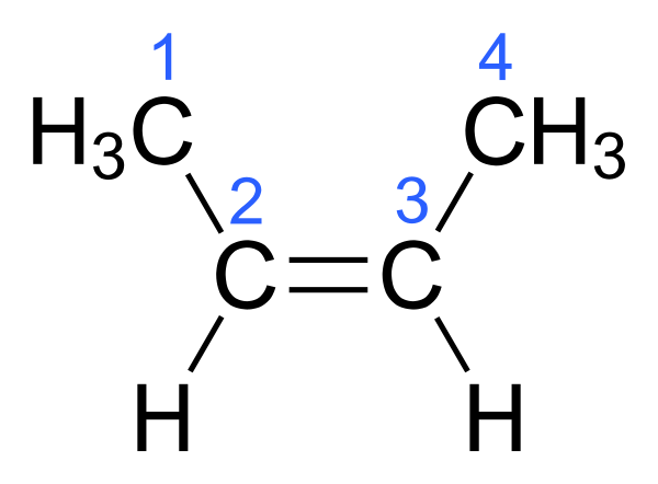 Если у диастереомера заместители расположены по одну сторону от двойной связи, такой изомер обозначают как цис-, если они расположены по разные стороны от плоскости двойной связи, то это транс-изомер. В качестве примера можно привести маленький углеводород 2-бутен.
