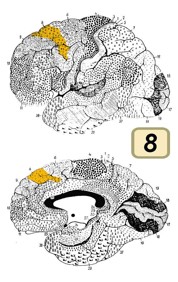 Анатомически 8-е цитоархитектоническое поле Бродмана 8 располагается в задних отделах верхней и средней лобных извилин.