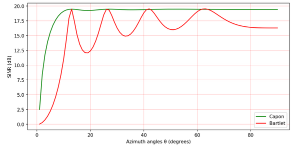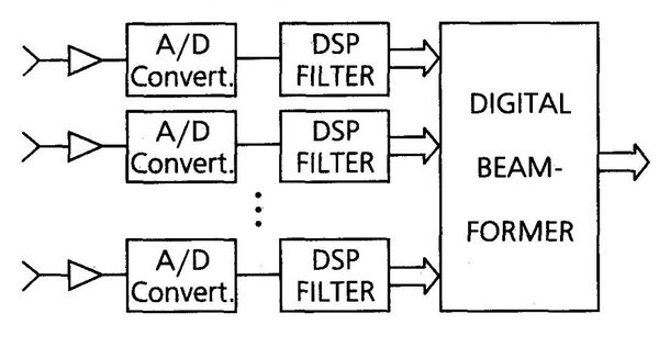- Цифровое формирование высокоидентичных частотных фильтров на выходе приёмных устройств обеспечивает глубокую компенсацию широкополосных помеховых сигналов. В сочетании с расширением динамического диапазона при накоплении в процессе пространственно-временной обработки это обеспечивает недостижимую ранее помехозащищённость. Максимальная глубина «нулей» диаграммы направленности в направлениях на источники помех в ФАР ограничена малой разрядностью фазовращателей (5 — 6 бит), в ЦАР же используются АЦП с разрядностью 12 — 16 бит.