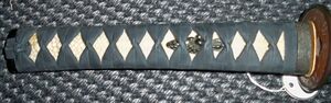 Рукоять имеет также различные металлические части, каждая из которых имеет своё название. На конце рукояти находится касира, навершие. На обратной стороне — фути, имеющая дно с отверстием (накаго-ана) для хвостовика меча (накаго). Между клинком и фути находятся две сэппа, тонкие пластинки, обычно из латуни, между которыми — цуба. Кроме того, под обмотку подсовываются небольшие металлические украшения, называемые мэнуки.