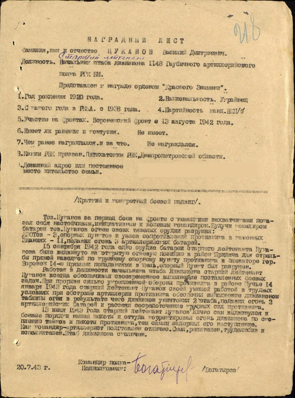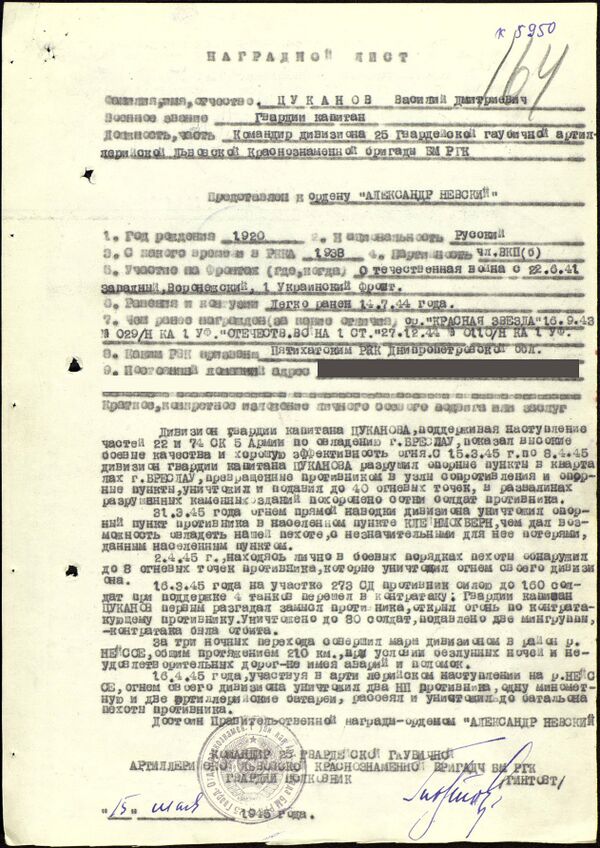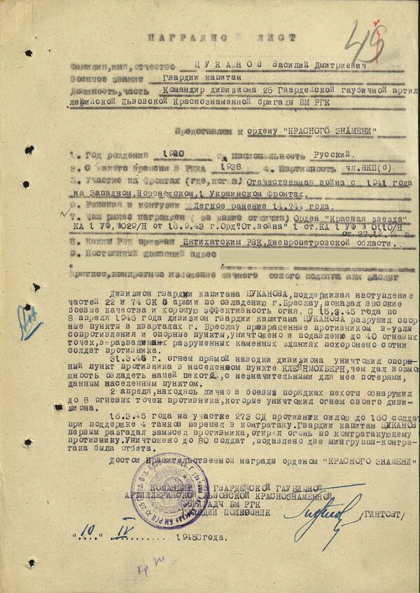 Длительное время не имея подтверждения тому, что поданное представление о награждении офицера было или же будет реализовано, и в связи с окончанием боевых действий, командир бригады вновь готовит представление к награде на гвардии капитана Цуканова, в котором почти дословно отражает текст предыдущей реляции, дополняя её заслугами, совершенными дивизионом под командованием гвардии капитана Цуканова в последние дни войны: