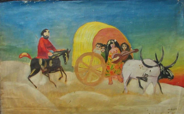 На полотне представлен пейзаж, центральное место в котором занимает кибитка с двумя женщинами и двумя детьми внутри. Справа от кибитки изображены два вола, а слева — мужчина, сидящий верхом на лошади. Композиция построена с акцентом на сочетание жанровых фигур и элементов сельской местности.