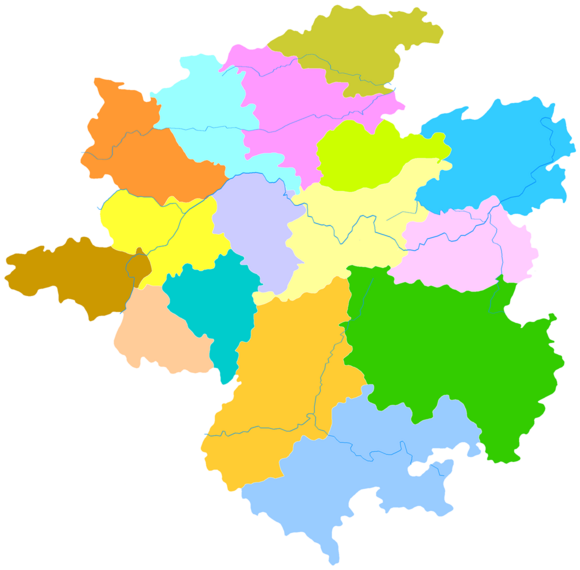 Автономный округ делится на 1 городской уезд и 15 уездов: