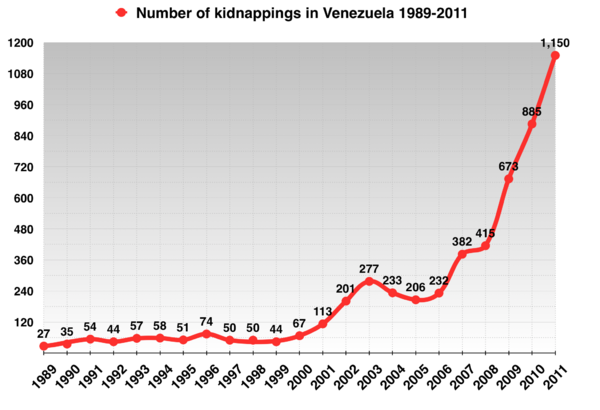 По статистике Национального института статистики, утёкшей в прессу, в 2009 году в стране имели место 16 917 похищений[251][262], лишь по 7 процентам из которых были открыты уголовные дела. 90,4 процента таких преступлений происходили в городской местности, 80 из них носили быстрый характер, а их жертвами в подавляющем большинстве случаев становились мужчины среднего возраста, принадлежавшие к низшему среднему и среднему классам[262]. В 2009 году в газетах появилась информация о том, что власти планируют прикрепить следователей к районным моргам в Каракасе, чтобы полицейские информировали родственников убитых. Тем советовали не сообщать о смерти близких в СМИ в обмен на ускорение процедуры выдачи тела[263]. В сентябре 2010 года Чавес признал, что с начала его правления уровень преступности в Венесуэле вырос[264]. В том же году Международная кризисная группа опубликовала доклад, в котором утверждалось, что рост преступности в первые годы его президентства был вызван в том числе факторами, на которые он не мог повлиять. При этом согласно данным этой организации Чавес игнорировал коррупцию в высших эшелонах власти, а международные преступные группировки благодаря покровительству властей вели деятельность как в Венесуэле, так и в Колумбии, что привело к росту числа похищений и убийств на душу населения и объёмов наркоторговли. Сторонники президента утверждали, что благодаря полиции преступная активность в стране снизилась, а в штатах, где уровень убийств высок, правит оппозиция[265].