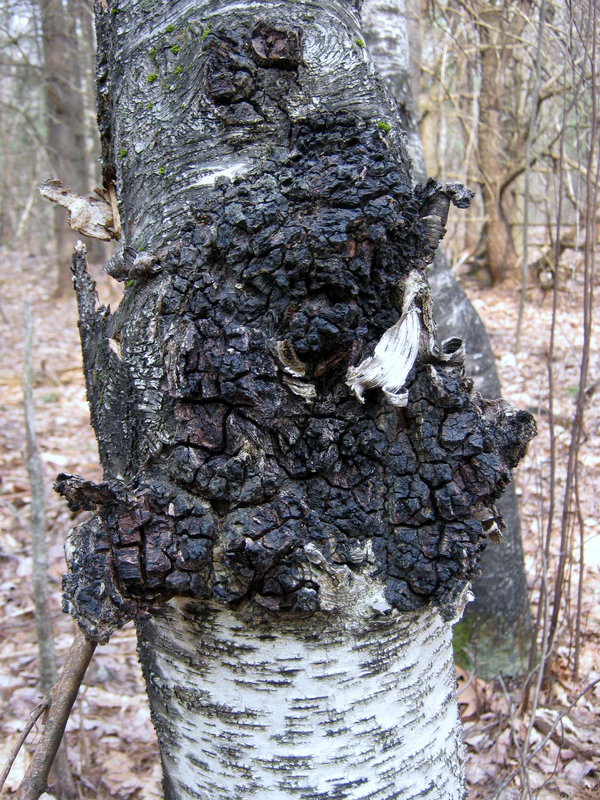 Чага образуется в результате заражения дерева паразитным грибом Inonotus obliquus. Его споры прорастают только в том случае, если попадают на повреждённые участки коры деревьев. Заражение вызывает белую ядровую гниль древесины. Сначала в ложном ядре появляются светло-жёлтые пятна и полосы, которые затем расширяются и сливаются. Годичные слои в гнили легко отделяются друг от друга. Вокруг гнили наблюдается светло-бурая защитная зона, внутри видны черные линии, а на изломе — ржаво-бурые вкрапления грибницы.[2]