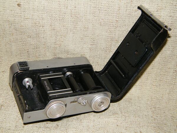 - Взвод затвора и перемотка плёнки — курком на нижней панели, несъёмная приёмная катушка.