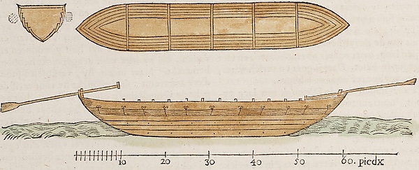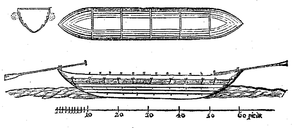 Казаки строят челны́ длиною в 60, шириною от 10 до 12, а глубиною в 12 футов. Челны́ сии без киля, дно их состоит из выдолбленного бревна ивового или липового, длиною около 45 футов; оно обшивается с боков на 12 футов в вышину досками, которые имеют длину от 10 до 12, а в ширину 1 фут и приколачиваются одна к другой так точно, как при постройке речных судов… Длина его постепенно увеличивается кверху: это яснее видно из приложенного рисунка. На оном можно заметить толстые канаты из камыша, которые обвиты лыками или боярышником и, как связанные бочонки, обхватывают чёлн от кормы до носа… Челны́ казацкие, имея с каждой стороны по 10–15 вёсел, плывут на греблях скорее турецких галер… Открывают же неприятельский корабль или галеру прежде, нежели турки заметят их челны́, возвышающиеся над морской поверхностью не более 2,5 фута.