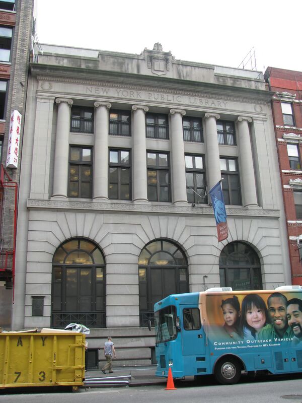 Нью-Йоркская публичная библиотека управляет филиалом Чатем-сквер на Ист-Бродвее, 33. Филиал основан в 1899 году; нынешнее здание библиотеки Карнеги открылось в 1903 году и было реконструировано в 2001 году. В четырёхэтажной библиотеке находится большая коллекция китайской литературы, которая хранится здесь с 1911 года[23].