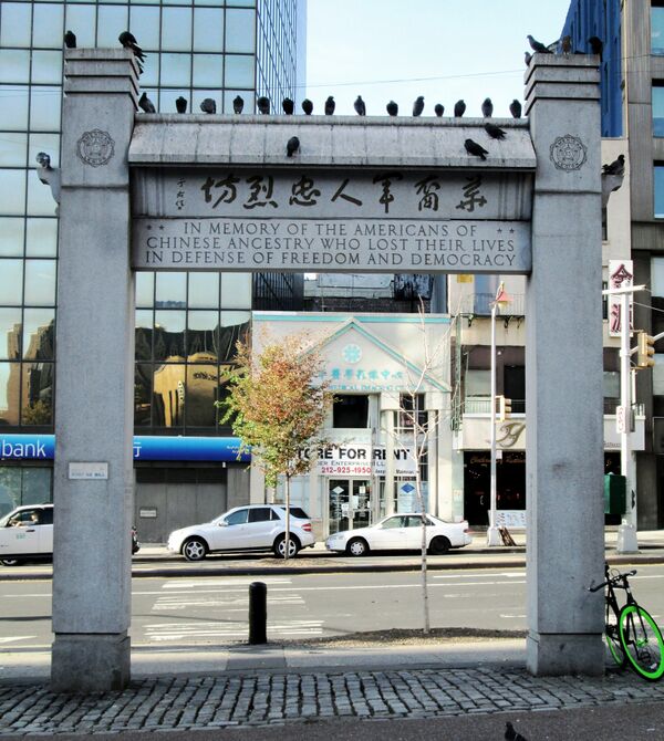 На протяжении большей части истории в Чайна-тауне имелись уникальные архитектурные особенности, по которым обыватель сразу мог бы узнать этот нейборхуд. В 1962 году на Чатем-сквере была установлена мемориальная арка в честь лейтенанта Бенджамина Ральфа Кимлау — лётчика США китайского происхождения, погибшего во время Второй мировой войны в Новогвинейской кампании. Арка посвящена американцам китайского происхождения, погибшим во Второй мировой войне. Она выполнена по проекту местного архитектора по имени Пой Гам Ли[24]. Мемориал украшен каллиграфией авторства Юй Южэня. На площади также расположена статуя Линь Цзэсюя — фучжоуского чиновника, выступавшего против торговли опиумом в Китае. Её взгляд направлен вдоль Ист-Бродвея, где находится фучжоуский участок Чайна-тауна.