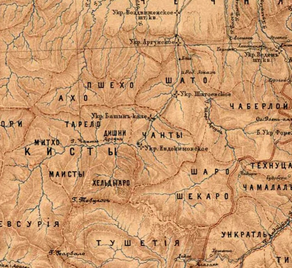 Одна их группа – Мичкизы, Шубуты, Мерези, Мулки, Отчанская земля, Тшанские люди – ведет к Чечне». Гидроним Чанты-Аргун, названия р. Чанты-ахк, горы Чанты-барз, безусловно, связаны с «Отчанской землей» в русском документе 1621 г., выявленного Е.Н. Кушевой, – считал С.-Э. Бадаев