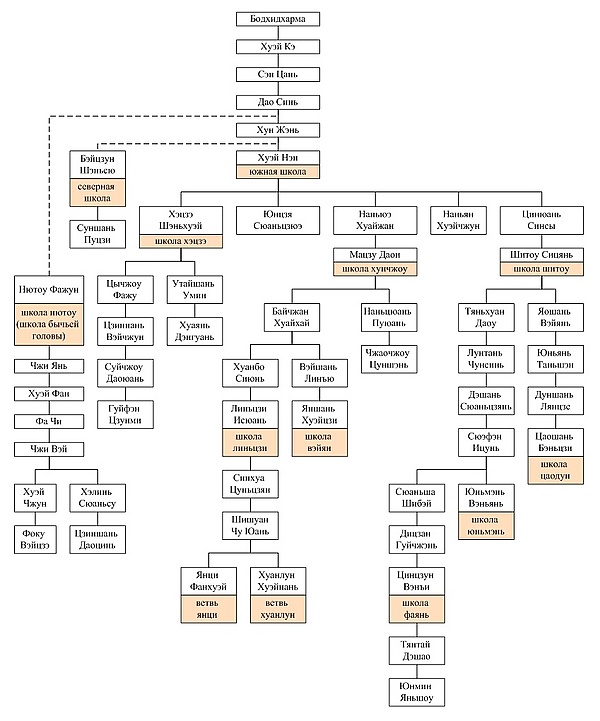В период с 907 по 960 год в Китае сформировались различные школы чань, получившие известность как «Пять Домов»[57]. Профессор А. А. Маслов отмечал, что с VI по X века в Китае появились десятки, а позже сотни чаньских школ, не имевших между собой никакой связи, но обучавших практике дхьяны[58]. Но классическими в соответствии с традиционной китайской пятеричной системой стали только пять[59]. В целом школы не имели больших отличий друг от друга, придерживаясь единого направления. Два главных «дома» чань Цаодун (яп. Сото) и Линьцзи (яп. Риндзай) стали основоположниками современного дзэн[57].