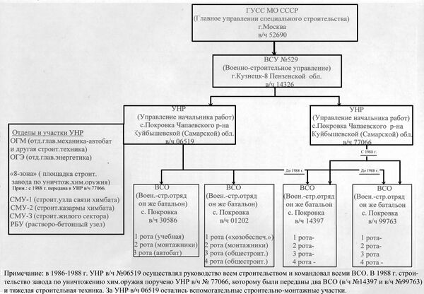 В свою очередь УНР командовало приданными им военно-строительными отрядами (ВСО), они же военно-строительные батальоны, комплектуемые военнослужащими срочной службы. На химплощадке размещались четыре ВСО: в/ч № 30586 (командир подполковник Байболатов), в/ч № 01202 (командир майор Гилязов И.Г.), в/ч № 14397 (командир подполковник Каверда В.), в/ч № 99763 (командир майор Будник, с 1988 капитан Ермаков).