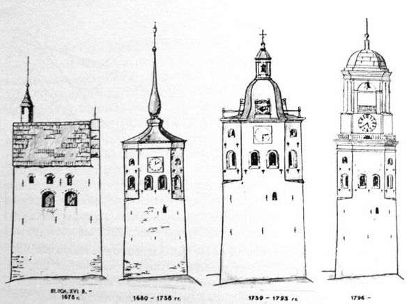 В 1660 году на колокольне установлены первый часовой механизм и циферблаты. В последней трети XVII века пострадавшая от пожара башня была отремонтирована и надстроена, получив форму восьмерика на четверике. В результате городского пожара 1678 г. башня полностью выгорела. В 1678-1681 гг. на старом каменном четверике из кирпича был возведен новый объем в форме восьмерика. В высоких оконных нишах расположилась звонница, старые ниши в четверике строители заложили кирпичом. Надстроенная колокольная была увенчана высоким барочным шпилем с флюгером в виде церковного петуха.
