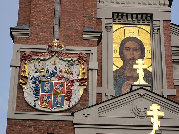 В облике часовни-усыпальницы главенствует огромная мозаика «Христос Вседержитель»[43]. Это живописное мозаичное панно с изображением Спаса Вседержителя (Пантакратора), неотступно смотрящего на зрителя[9][56], размещённое над притвором, включает в себя охристого цвета лик Христа в синем хитоне на эффектном золотистом фоне[9][5]. Это потрясающее наряду с масштабностью звонкое сочетание чистых цветов призвано было восприниматься с дальних расстояний[43]. По мнению искусствоведа А. Г. Шимелевич[9],