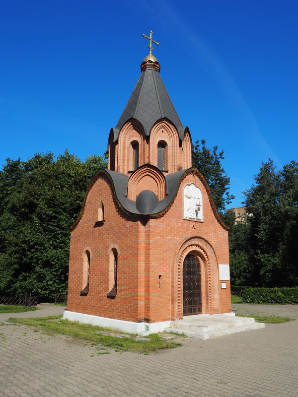 Небольшая шатровая часовня из красного кирпича квадратная в плане и имеет высоту 14 м[18]. Её венчает главка с крестом, в основании которого помещён полумесяц[31]. Вход в часовню со стороны центральной аллеи парка. Над входом — белокаменный барельеф с изображением Георгия Победоносца.