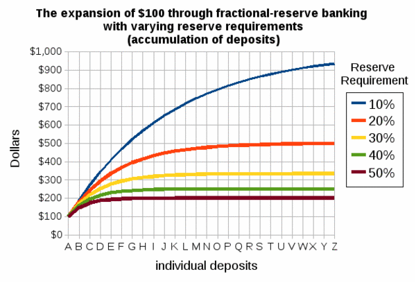 Когда наличность отдаётся на хранение в банк, лишь некоторая часть этих средств удерживается в качестве резерва, а оставшаяся часть может быть выдана в виде кредита (или потрачена банком на покупку ценных бумаг). Деньги, выданные или потраченные подобным образом, впоследствии размещаются на хранение в другом банке, тем самым создавая новые депозиты и позволяя снова выдавать их в кредит. Кредитование, повторное депонирование и повторное кредитование денежных средств увеличивает денежную массу в стране. Из-за повсеместного частичного банковского резервирования, денежная масса большинства стран во много раз превосходит денежную базу, созданную центральным банком страны. Такое умножение (называемое денежным мультипликатором) ограничивается нормой обязательных резервов или требованиями других финансовых коэффициентов, предписанных финансовыми регуляторами[5][6].