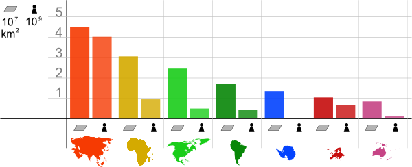 | Континент | Длина (км из востока на запад, и с юга на север, по периферии) | Доля суши | Население | Доля населения | Плотность населения |