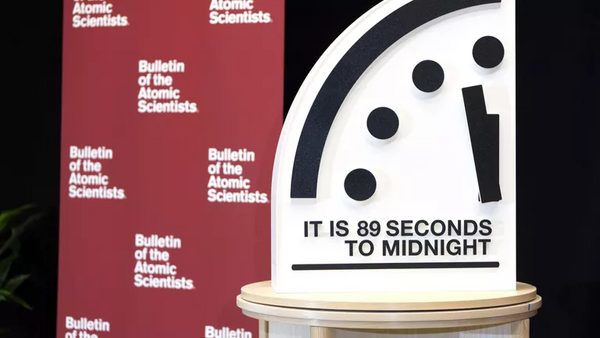 | 2023 | 1:30 | 23:58:30 | −0:10 | Военные действия на Украине и возросший риск ядерной эскалации. Это затронуло атомные реакторы в Чернобыльской и Запорожской АЭС, создавая риск широкомасштабного выброса радиоактивных материалов. 4 октября 2022 года Северная Корея провела испытание баллистической ракеты средней дальности. Срок действия последнего оставшегося договора о ядерном оружии между Россией и США истекает в феврале 2026 года, если стороны не продлят соглашение или не заключат новый договор. На новое время часов также повлияли сохраняющиеся угрозы, связанные с климатическим кризисом и разрушением глобальных норм и институтов, необходимых для снижения рисков, связанных с развитием технологий и биологических угроз, таких как COVID-19. До полуночи осталось 90 секунд[13]. |