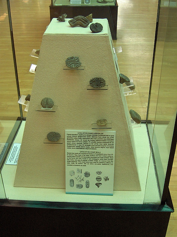 Представлены рельефы с изображением больших кошек (скорее всего леопардов и обычно попарно). Скульптуры бычьих голов были с особенностью, они крепились или на стены, или на низкие платформы, некоторые из этих быков возглавляли целые ряды из голов. Найдено множество женских статуэток из мрамора, коричневого и голубого известняка, кальцита, сланца, базальта, алебастра и глины. Среди самых известных находок выделяется статуэтка из обожжённой глины высотой 16,5 см, изображающая сидящую тучную женщину с оружием, которая отдыхает на двух больших кошках. Эта статуэтка схожа с Венерой Виллендорфской. Двух кошек некоторые учёные считают львами[14], а другие полагают, что это леопарды[15]. Некоторые учёные предлагают версию, что статуэтка изображает женщину, которая вот-вот родит[14]. Статуэтка с сидящей женщиной самая сложная из найденных фигурок. Среди более простых встречается женская фигурка с отверстием в спине, возможно, в это отверстие засыпалось зерно.