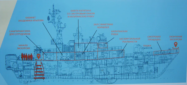 Экспозиция музея состоит из шести залов, один из которых посвящён академику, кораблестроителю и генералу флота Алексею Николаевичу Крылову, уроженцу Алатырского района Чувашии. Также на корабле можно осмотреть каюту капитана со смотровым окном в капитанскую рубку, зал с макетами кораблей, элементы вооружения корабля, особое внимание туристов привлекает зал виртуальной реальности[6].