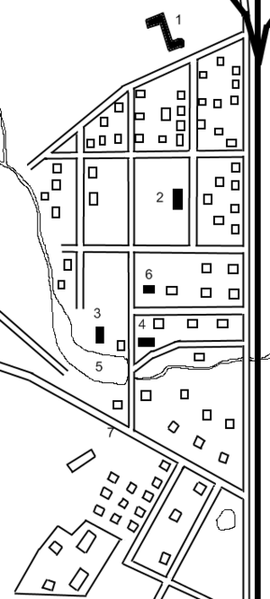 План Челноковского парка, 1930-е: 1 — Ремесленное училище (Лицей № 2), 2 — Дача Челнокова, 3 — Летний сад Вагоностроительного завода с танцплощадкой и кинотеатром, 4 — Клуб, 5 — Запруженая река Работня (Челноковский пруд), 6 — Дача Шермана, 7 — Улица Большая Рупасовская.