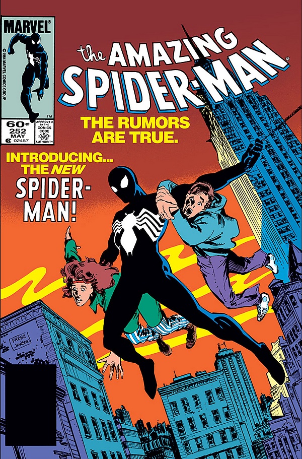 С 1984 по 1988 годы Человек-паук носил костюм, отличающийся от классического оригинала. Чёрный с белыми вставками вариант впервые появляется в The Amazing Spider-Man №252 (май 1984), а его история рассказывается в ограниченной серии комиксов Secret Wars (рус. Тайные войны), где на другой планете Человек-паук участвует вместе с остальными героями Земли в битве против суперзлодеев[48]. Новый вариант костюма сопровождался полемикой среди поклонников комиксов, которые считали, что такая радикальная смена классического костюма равносильна кощунству, так как костюм — главная отличительная черта Человека-паука, как Бэтмена или Супермена[49]. Позже создатели ввели объяснение: новый костюм был симбиотом, от которого Человек-паук смог освободиться после событий Тайных войн[50]. Позже тот же симбиот возвращается в качестве Венома с намерением отомстить.