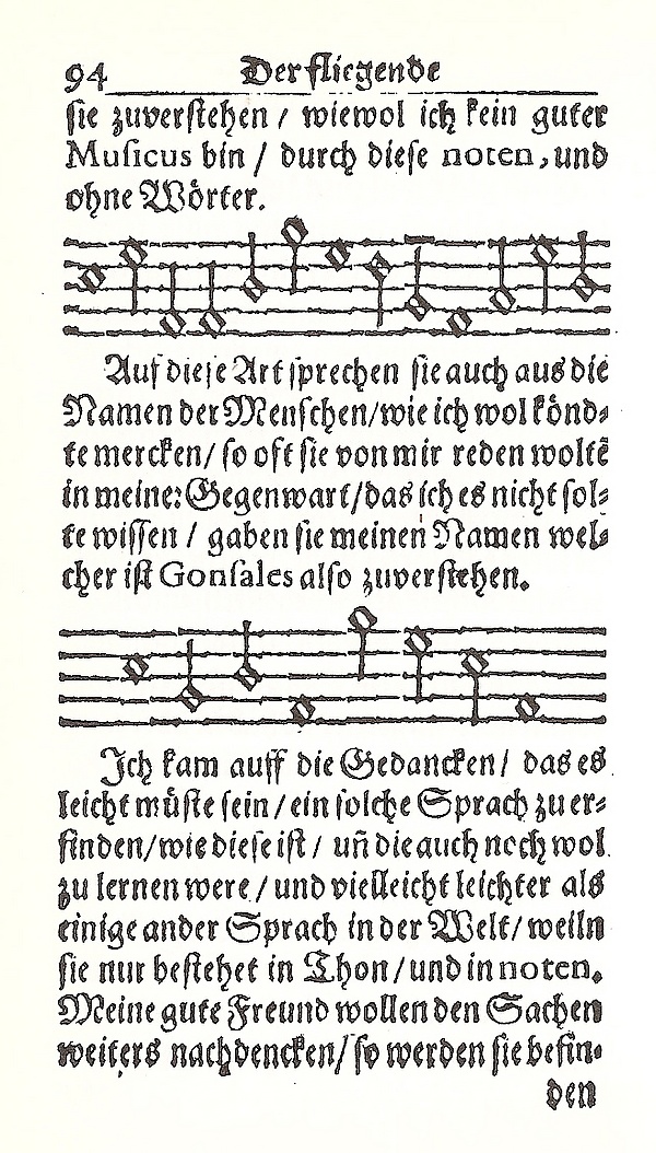 Годвин всю жизнь интересовался языками и передачей информации (как это видно в различных средствах общения, которые Гонсалес применял для обмена информацией со своим слугой Диего на острове Святой Елены), и это было темой его Nuncius inanimatus (1629).[6] Язык, с которым Гонсалес сталкивается на Луне, не похож ни на один из знакомых ему. Гонсалесу понадобились месяцы, чтобы научиться достаточно быстро общаться с жителями Луны. Хотя словарь этого языка ограничен, но его выразительные возможности умножаются, поскольку смысл слов и фраз также зависит от тона. Искусственные языки были важным элементом более ранних фантастических рассказов, таких как «Утопия» Томаса Мора, "«Гаргантюа и Пантагрюель» Франсуа Рабле и Mundus Alter et Idem Джозефа Холла; со всеми этими книгами Годвин был знаком.[26] П. Корнелиус написал работу об искусственных языках в выдуманных путешествиях XVII и XVIII веков, в которой утверждает, что совершенная, рационально организованная речь свидетельствует о просветительском рационализме.[27] Как утверждает Г. Невилл-Дэвис, искусственный язык Годвина совершеннее, чем, например, Мора, в одном аспекте: на нём говорят на всей Луне, и он не пострадал от земного расхождения языков после падения Вавилонской башни.[26]