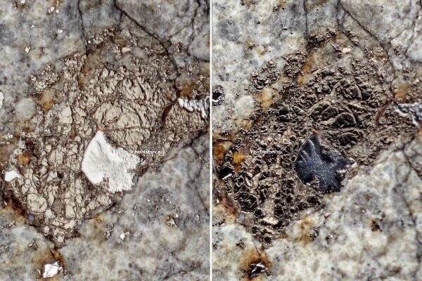 Центральная часть фрагментов метеорита сложена крупными (до 1-2 мм) зёрнами оливина и ортопироксена, в подчинённом количестве хромита и клинопироксена, с крупными обособлениями металлического железа и троилита. Межзерновые пространства заполнены мелкозернистым агрегатом кристаллов Mg-Fe-х силикатов, хромита, плагиоклаза, Ca-фосфатов, стекла и металл-сульфидных глобулей[18].