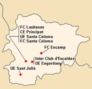 В чемпионате Андорры приняло участие 8 команд из 6 населённых пунктов.