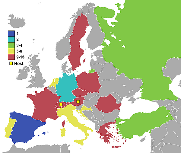 Австрия: Эрнст Хаппель (Вена), Хипо-Арена (Клагенфурт), Вальс-Зиценхайм (Зальцбург), Тиволи Ной (Инсбрук) Швейцария: Стад де Сюисс (Берн), Санкт-Якоб Парк (Базель), Стад де Женев (Женева), Летцигрунд (Цюрих) |