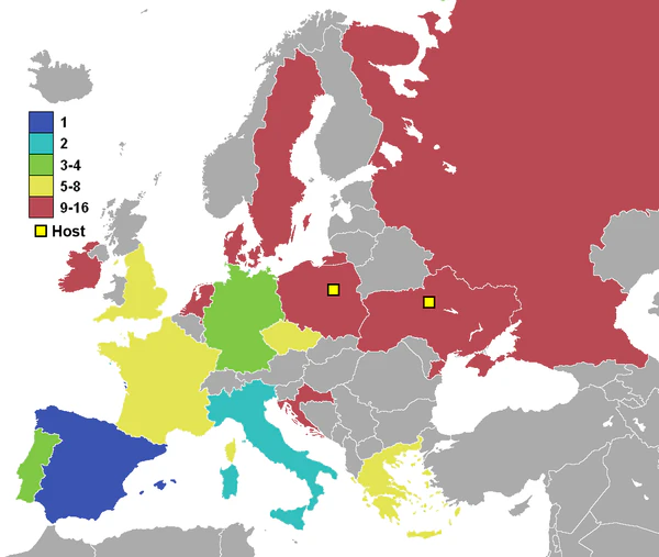 Первые позиции в группе A и в группе D занимают команды стран, организующих проведение чемпионата — Польши и Украины соответственно.