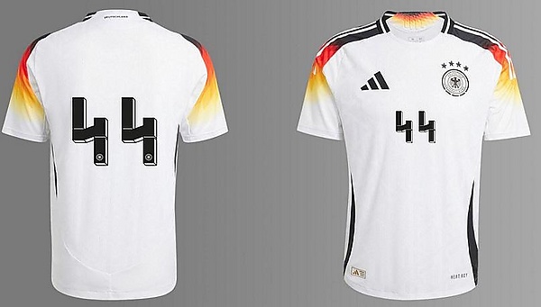 1 апреля 2024 года компания Adidas запретила № 44 на форме сборной Германии из-за сходства с эмблемой СС. Новую форму представили 14 марта 2024 года. Основной комплект белого цвета в сочетании с цветами флага страны — чёрным, жёлтым и красным. На сходство цифры 4 на белой форме с руной ᛋ, а номера 44 — с нацистским символом обратил внимание журналист Тобиас Хух[27].