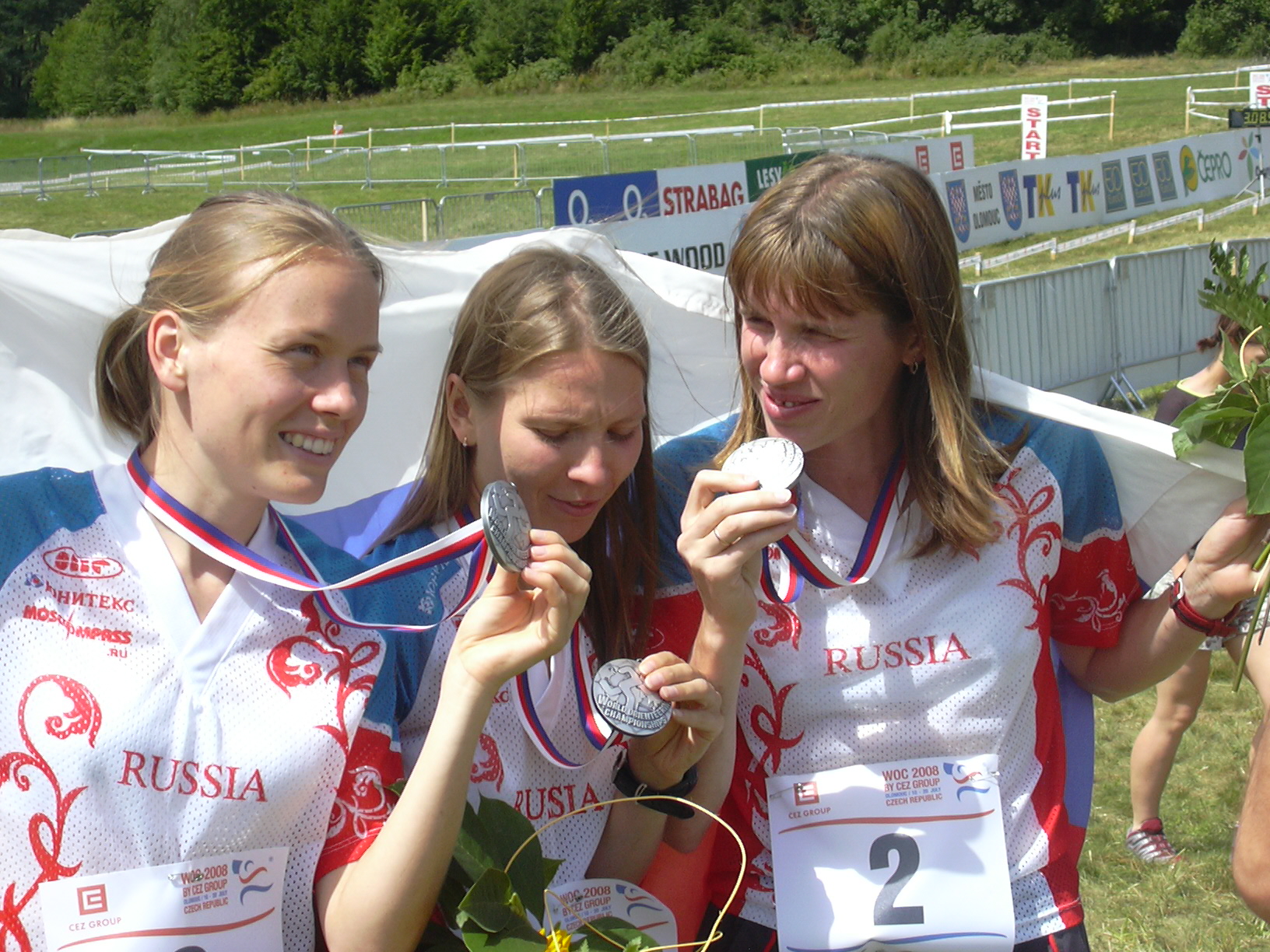 | Россиянин Андрей Храмов на длинной дистанции чемпионата мира 2007 в Киеве | Женская эстафетная команда с серебряными медалями чемпионата мира (Оломоуц, Чехия, 2008 год). Слева направо: Т. Рябкина, Ю. Новикова, Г. Виноградова |