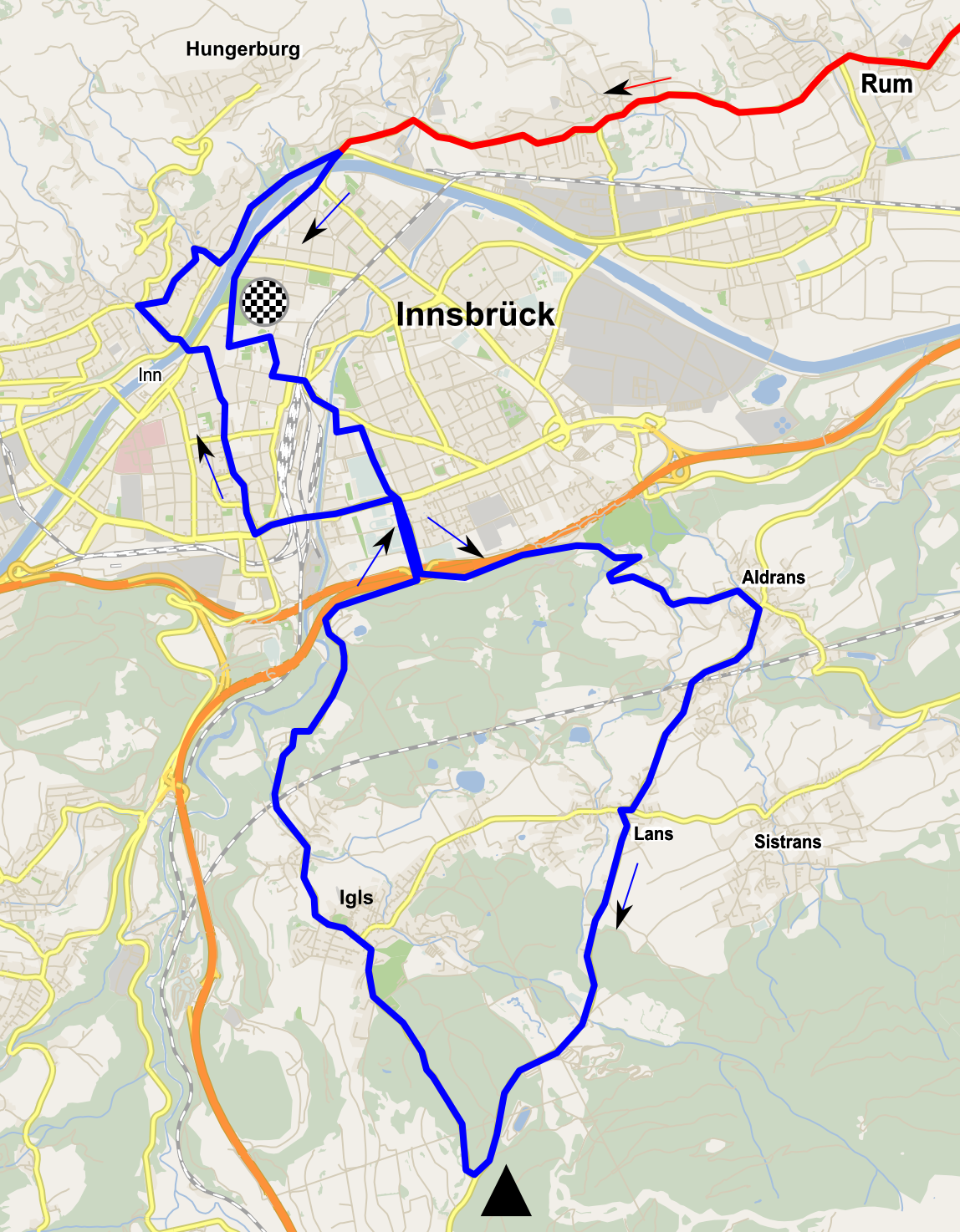 Протяженностью маршрута составила 70,2 километра. Старт располагался в Раттенберге. Первые 47,9 километров проходили по равнине в округе Швац через города Бух-бай-Енбах и Шарниц где пересекали реку Инн. Далее заехав в Терфенс предстояло преодолеть первый подъём протяжённостью 2,6 километра со средним градиентом 7 % и максимальным до 14 %, вертикальный подъём составил 350 метров. Его вершина располагалась на равнине в Гнаденвальде. После этого следовал спуск через Абзам, Таур и Рум до Инсбрука.