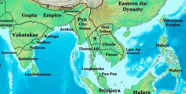 В середине VI века Ченла была вассалом Бапнома (Фунани), однако к концу века достигла независимости и в конечном счёте завоевала всю её территорию, абсорбировав её народы и культуру. Ослабление Фунани в этот период может во многом объясняться закатом Римской империи и, вследствие этого, уменьшением объёма торговых контактов между Средиземноморьем и суйским Китаем.