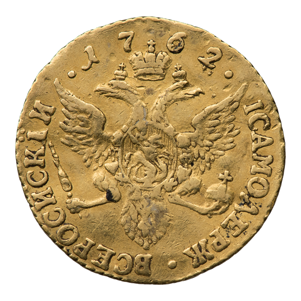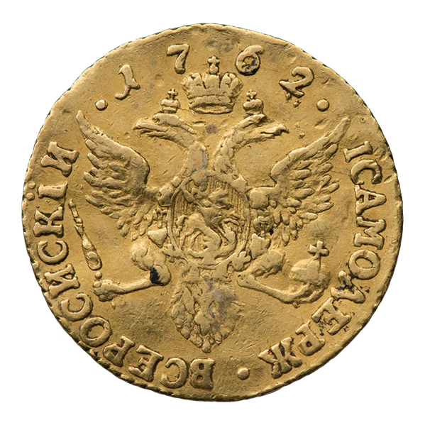 Снизу по кругу монеты размещена надпись «IСАМОДЕРЖ•ВСЕРОСИСКІЙ•», буквы при этом обращены основанием внутрь. Сверху, над головами орла указана дата чеканки — «1762»[4].