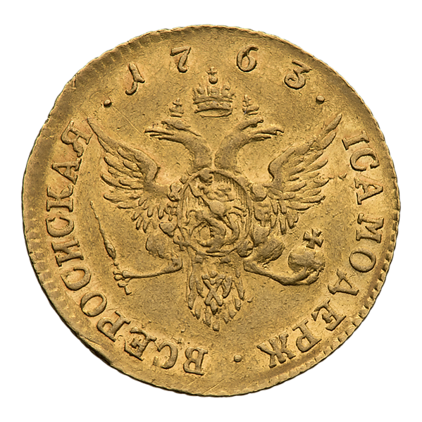 На аверсе червонца изображён правый профильный портрет Екатерины II в богато украшенном платье и мантии. Через правое плечо надета Андреевская лента. На голове располагается малая императорская корона, волосы украшены жемчугом и драгоценными камнями, на правом плече два локона. Круговая надпись: «Б∙М∙ЕКАТЕРИНА∙II∙IMПЕРАТРИЦА». Под бюстом обозначен монетный двор: «СПБ». На реверсе изображён герб Российской империи середины XVIII века — двуглавый орёл под тремя коронами. На груди орла расположен щит с гербом Москвы, окружённый цепью ордена святого Андрея Первозванного. В правой лапе он сжимает скипетр, в левой держит державу. Круговая надпись: «∙IСАМОДЕРЖ∙ВСЕРОСИСКАЯ∙1763»[26][27][28][29][30].