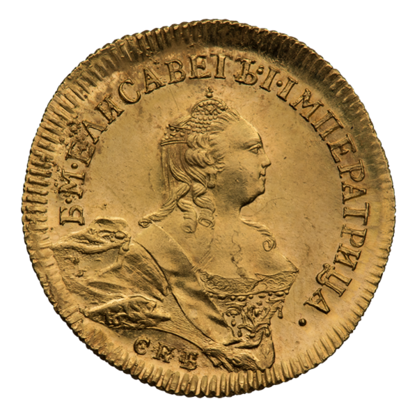 Во времена правления Елизаветы Петровны червонцы чеканились из золота 968 пробы, их диаметр составляет от 22,1 до 22,4 мм, а вес равен 3,47 г, чистого золота 3,36 г. Были выпущены в Красном монетном дворе в количестве 16 600 экземпляров. Гурт является гладким[14][15][16][17][18].
