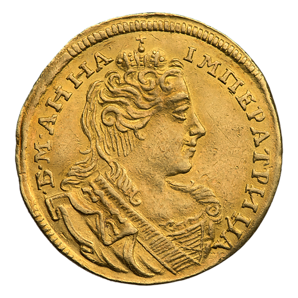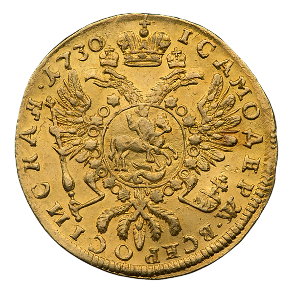 Во времена правления Анны Иоанновны червонцы чеканились из золота 968 пробы, их диаметр составляет от 20,4 до 21,0 мм, а вес равен 3,47 г, чистого золота 3,36 г. Были выпущены в Красном монетном дворе в количестве 8764 экземпляров. Гурт является гладким[9][10][11][12].