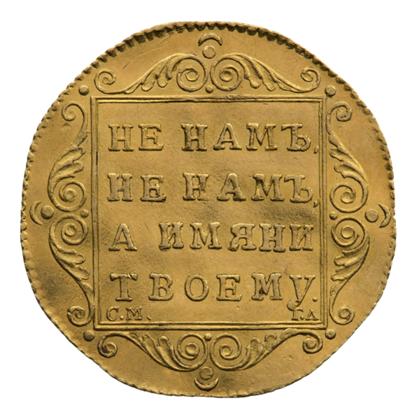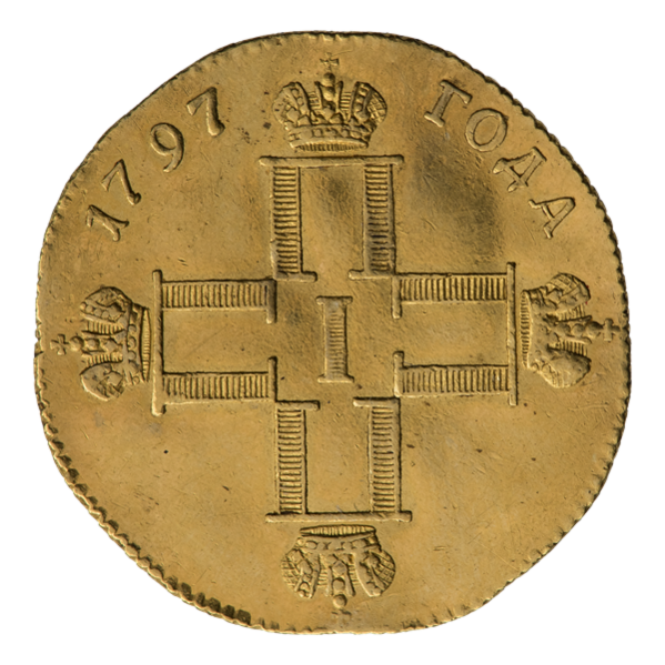 Детали червонца Павла I также менялись: на аверсе червонца 1797 года изображена монограмма императора в виде четырёх букв «П», которые увенчаны коронами. В центре указана римская цифра «I», сверху обозначена дата: «1797 ГОДА». На реверсе в четырёхугольном картуше изображена надпись в четыре строки: «НЕ НАМЪ, НЕ НАМЪ, А ИМЯНИ ТВОЕМУ». В левом нижнем углу обозначен монетный двор: «С∙М». В правом углу указаны инициалы минцмейстера: «Г∙Л» — Г. Львов[31][32][35][34].