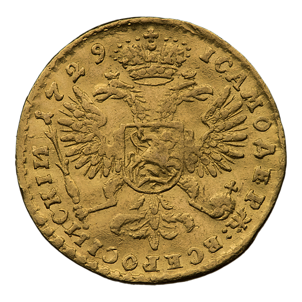 Во времена правления Екатерины II червонцы чеканились из золота 978 пробы, их диаметр составляет от 22,1 до 22,3 мм, а вес равен 3,47 г, чистого золота 3,39 г. Были выпущены в Санкт-Петербургском монетном дворе в количестве 50 000 экземпляров. Гурт является шнуровидный — наклон насечки вправо[26][27][28][29][30].