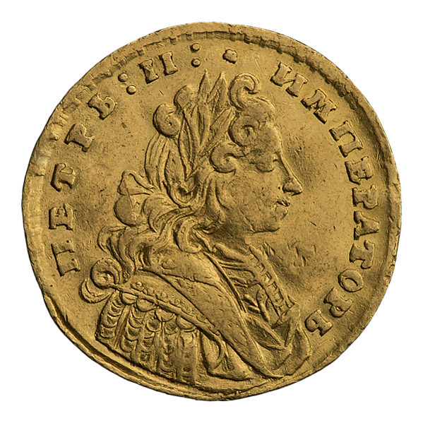 Червонцы были в Русском царстве во времена правления Петра I — в дальнейшем первого императора Российской империи. Изначально данные монеты чеканились из коробчатого золота 969 пробы, их диаметр составляет от 23,3 до 23,6 мм, а вес равен 3,47 г, чистого золота 3,36 г. Были выпущены в Кадашевском монетном дворе. Гурт является гладким[1][2][3][4].