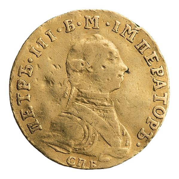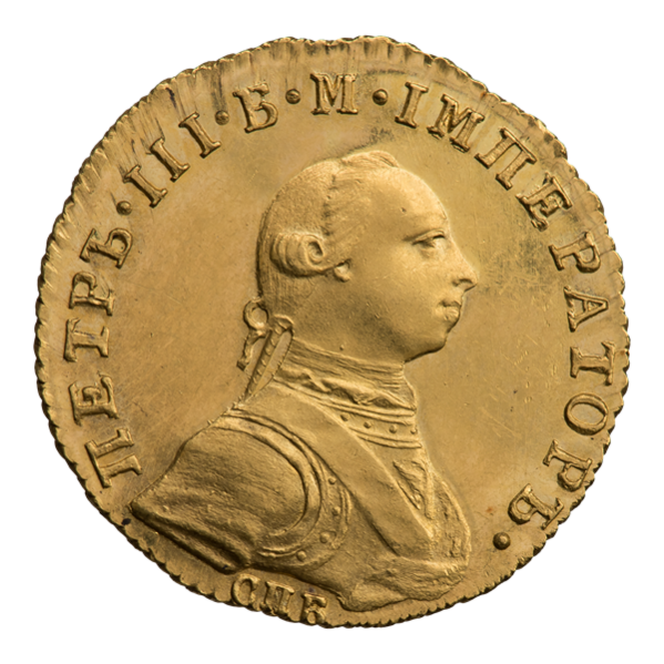 Во времена правления Петра III червонцы чеканились из золота 978 пробы, их диаметр составляет 20,2 мм, а вес равен 3,47 г, чистого золота 3,39 г. Были выпущены в Санкт-Петербургском монетном дворе в количестве 10 042 экземпляров. Гурт является шнуровидный — наклон насечки вправо[22][23][24][25].