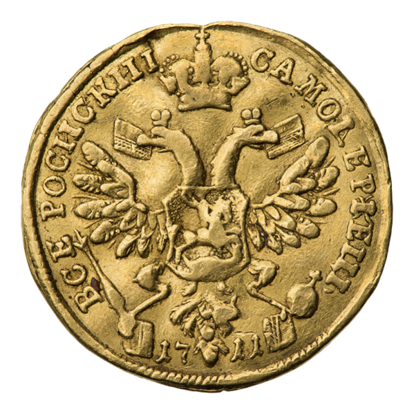 - На аверсе червонца 1711 года изображён правый профильный портрет Петра I в лавровом венке, в латах и мантии. Круговая надпись: «ЦРh ПЕТРh АЛЕѮIЕВИЧh». На реверсе на груди орла расположен правый щит со святым Георгием Победоносцем на коне, который поражает дракона. У орла в клювах и лапах расположены четыре карты, символизирующие господство Российской империи над четырьмя морями — Балтийском, Белым, Каспийским и Азовским. Круговая надпись: «В С Е Р О С И С К И I С А М О Д Е Р Ж Е Ц Ъ 17 11»[1][2][6][7][8].