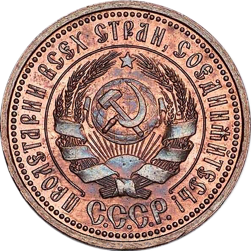 Аверс: в центре содержит обрамленный круговой незамкнутой линией и виньеткой снизу герб РСФСР: окружённый венком из хлебных колосьев щит-картуш с перекрещенными на нём серпом и молотом на фоне солнечных лучей. В виньетке под гербом надпись: Р. С. Ф. С. Р. Вдоль канта, с внешней стороны круговой незамкнутой линии надпись: ПРОЛЕТАРИИ ВСЕХ СТРАН, СОЕДИНѦЙТЕСЬ! Кант по всей окружности аверса украшен точечным орнаментом.