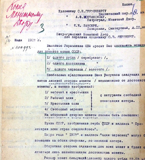 После образования 30 декабря 1922 г. Союза Советских Социалистических Республик, уже в январе 1923 г. было принято решение о выпуске монет с новыми геральдическими символами[6], герб РСФСР необходимо было заменить гербом СССР. В июне 1923 года подготовлены технические требования к конкурсу на изготовление эскизов для новых монет, в т.ч. червонцев, а 3 июля 1923 г. участникам, художникам-медальерам направлено Отношение за №404993: «Художнику: С.Н.Грузенбергу […] А.Ф.Васютинскому […] Е.Е.Лансере […] С.В.Чехонину. Валютное Управление НКФ просит Вас составить эскизы для штампов монет СССР: 1/одного рубля /серебряного/, 2/одного полтинника 3/одного червонца /золотого/. Необходимо представление Вами рисунков следующих вариантов лицевой стороны монеты /независимо от достоинства монеты/, а именно изображений: 1/рабочий и крестьянин 2/рабочий один 3/крестьянин один 4/свободный вариант. На оборотной стороне монеты должны быть помещены: Буквы СССР, изображение герба СССР и надпись «Пролетарии всех стран соединяйтесь» […] Срок представления 12 часов дня 15-го сентября 1923 года […]».[16] 22 ноября 1923 г. в адрес Монетного двора поступает письмо Валютного Управления Наркомфина об утверждении эскизов художника С.Н.Грузенберга: «Валютное Управление настоящим препровождает Вам утвержденное Народным Комиссаром Финансов Г.Я.Сокольниковым 13 ноября с.г.: 1/фотографические снимки рельефов новой российской монеты, а именно:[…] в/Золотой монеты в 1 червонец с изображением на лицевой стороне крестьянина, идущего по полю со снопом колосьев».[17] Однако утвержденные эскизы встречают довольно негативную реакцию со стороны руководства Монетного двора, в т.ч. А.Ф. Васютинского. Для решения разногласий 27 ноября 1923 года проводится заседание Заводоуправления Монетного двора с участием С.Н.Грузенберга и двух заместителей начальника Валютного Управления Наркомфина: М.Я.Лазерсона и Р.Я.Карклина. В итоге, согласно Протоколу заседания[18], большинством голосов (против проголосовал только М.Я.Лазерсон) эскизы одного рубля и одного полтинника утверждаются в редакции С.Н.Грузенберга с определёнными доработками. Что касается червонца, то Монетному двору было предложено изготовить в срочном порядке гипсовую копию с гербом СССР, оставив на второй стороне изображение с монеты чекана 1923 года 1 червонец, т.е. «Сеятеля».